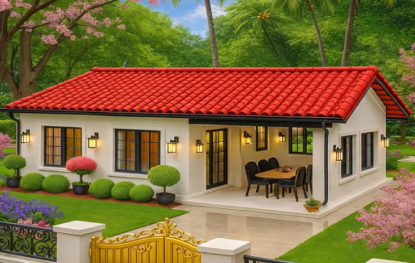 La vivienda presenta una estructura compacta y bien proporcionada, coronada por un techo de tejas rojas que aporta carácter y calidez visual. Este elemento no solo realza la estética general, sino que también evoca un estilo clásico que nunca pasa de moda. Las paredes de tonos claros refuerzan la luminosidad del conjunto, haciendo que la casa se vea fresca, limpia y muy acogedora desde cualquier ángulo.