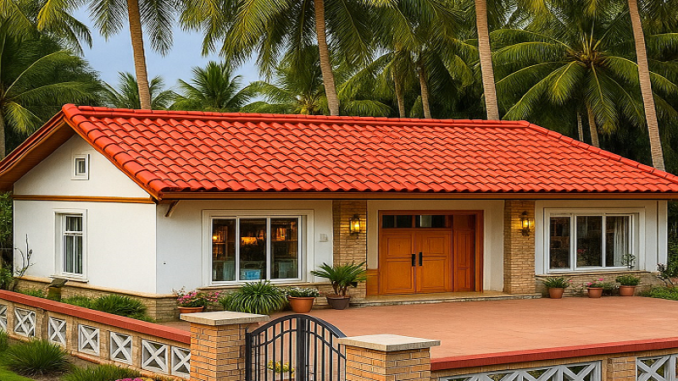Uno de los elementos más llamativos de esta vivienda es su techo de tejas rojas, que no solo aporta un estilo tradicional y acogedor, sino que también ofrece una excelente protección contra el sol y la lluvia. Este tipo de cubierta es muy común en zonas cálidas porque ayuda a mantener la temperatura interior más fresca. Además, el contraste entre el techo rojo y las paredes claras crea una apariencia muy atractiva y armoniosa.